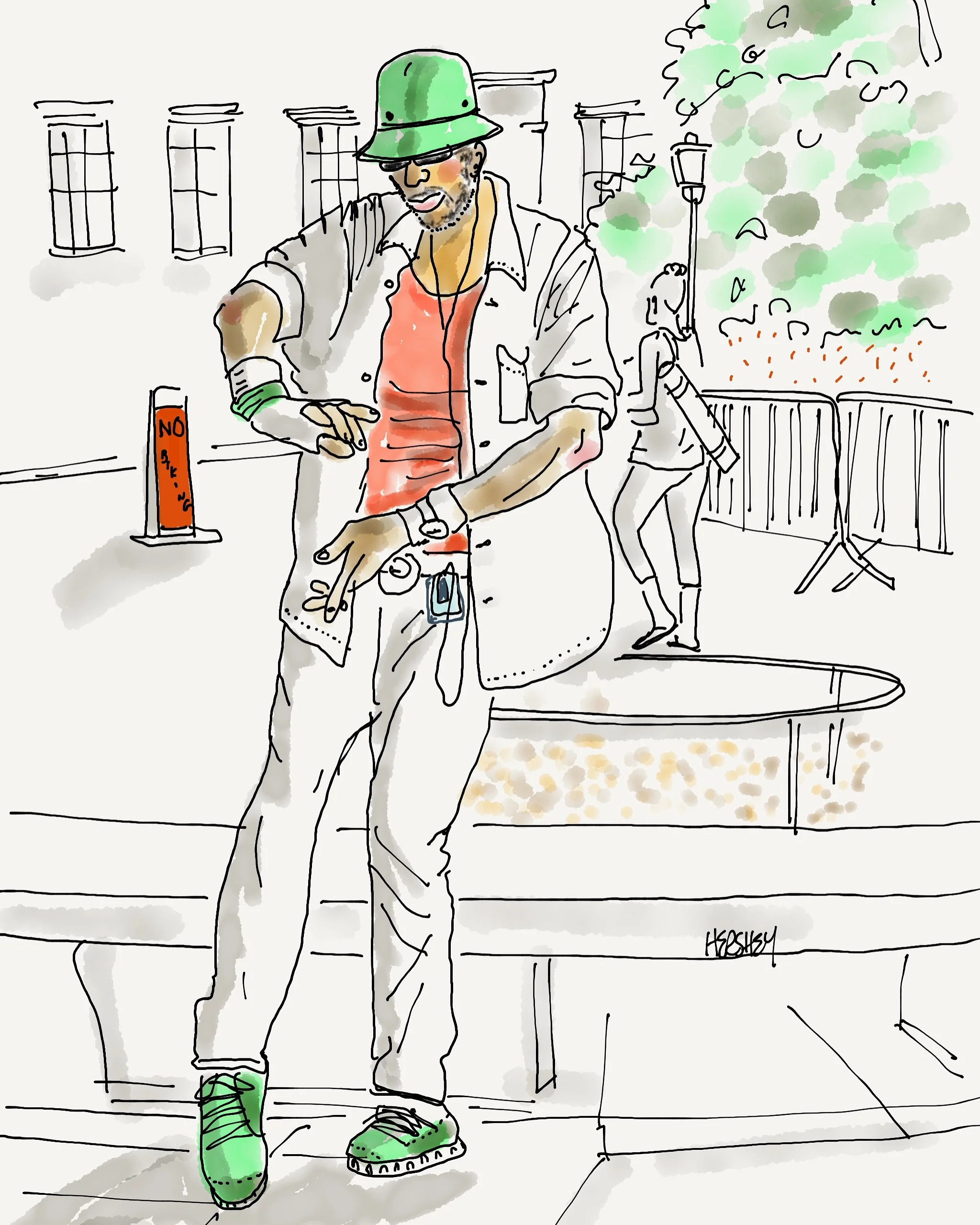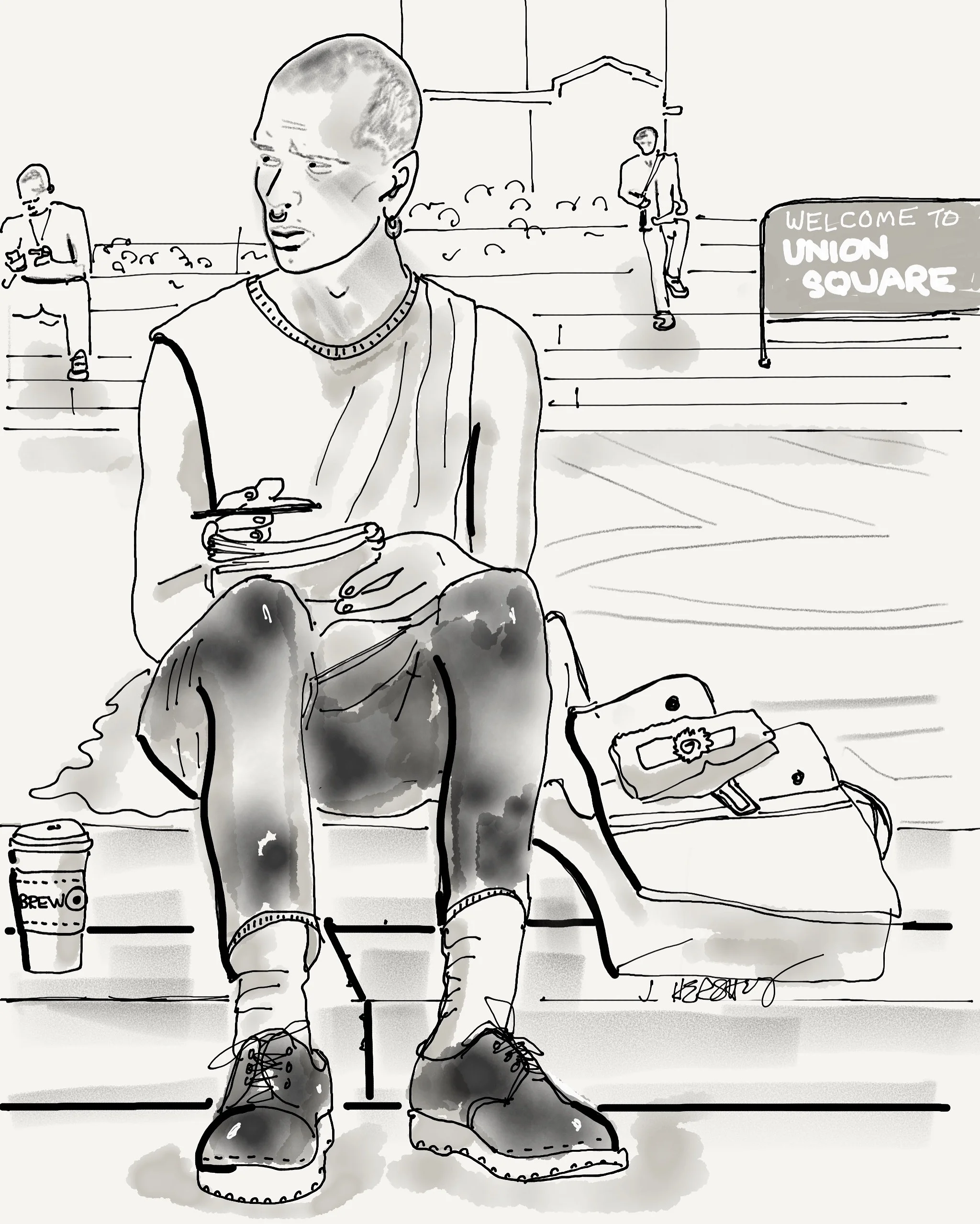 I started with pen and markers. But then I discovered 53paper and an iPAD pro and apple pencil. So now, I shoot photos, go through them and pick the ones that I want to draw. I never spend more than 30-45 minutes on a drawing. If I start to overdraw, they lose their vulnerability. I also draw 3 minute sketches while I actually sit on the train. They’re very fast line drawings but I try to capture just the essence of the person.